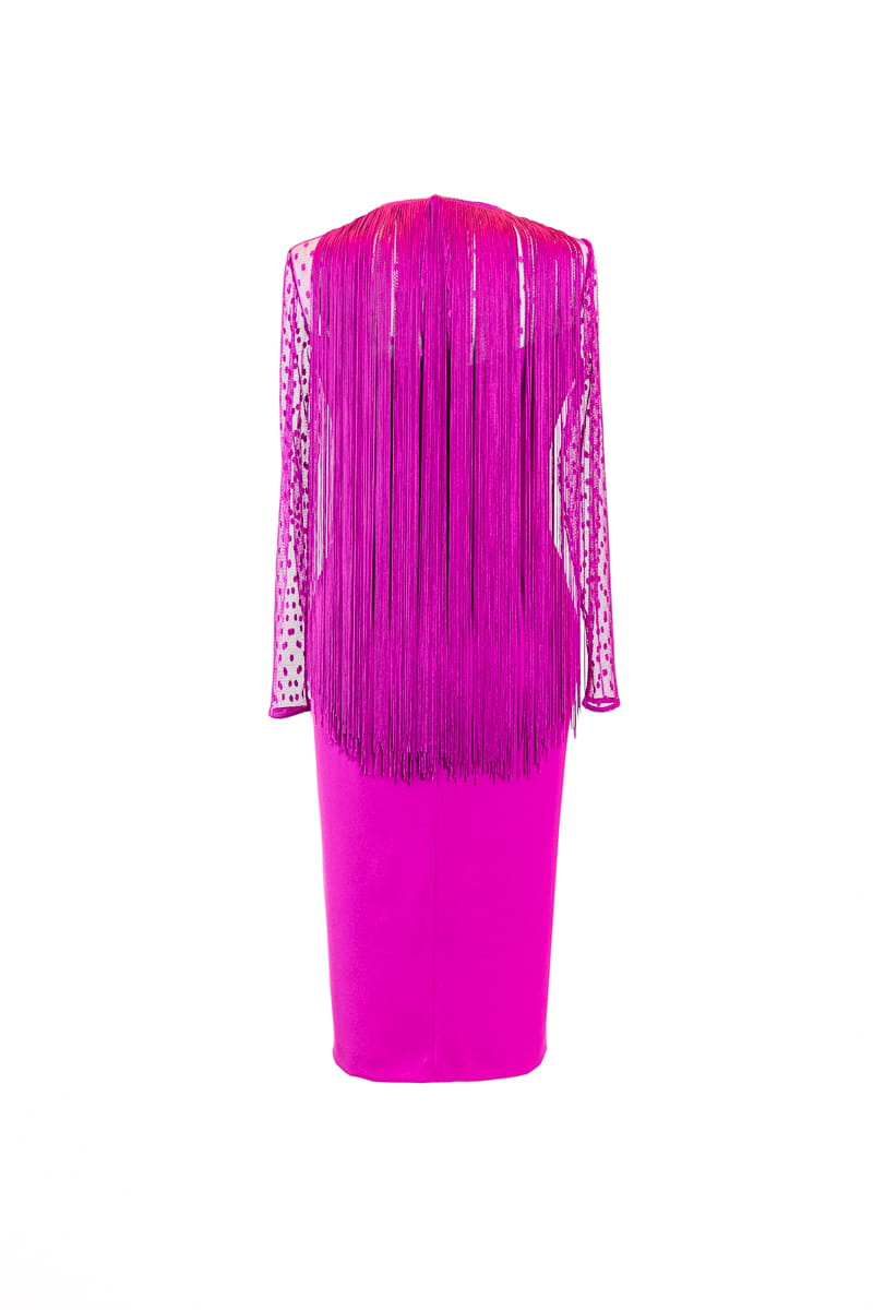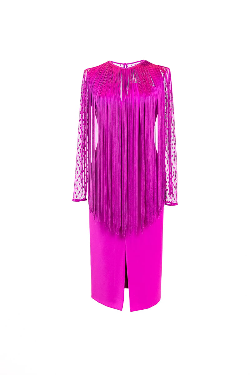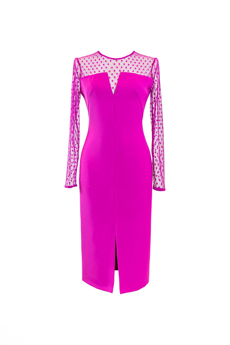 Vestido fiesta confeccionado en crepé y plumeti, escote barco con transparencia en escote y mangas.
